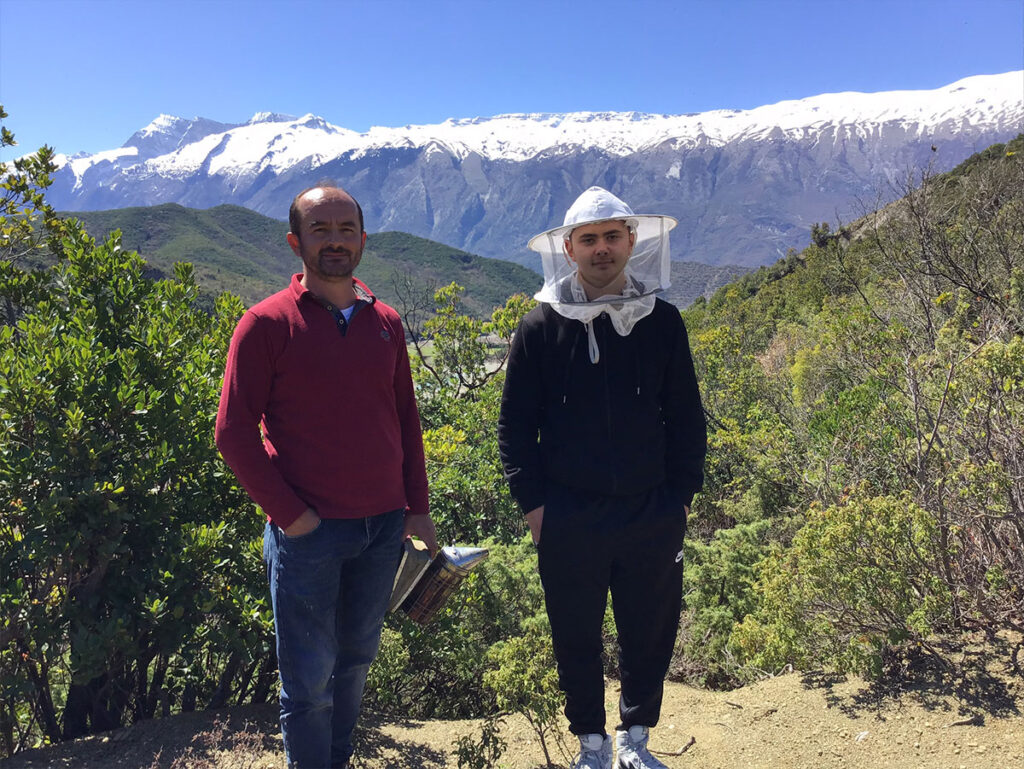 Flora’s Großmutter hatte seit ihrer Jugend Bienen. Als Bienenwohnungen dienten damals Strohkörbe und um an den Honig zu gelangen, wurden die Bienen getötet. Die Großmutter hatte das Alter von hundert Jahre erreicht, als sie vor 10 Jahren starb. Flora hat die Bienen von ihr übernommen. Ihr Mann Krenar ist Moslem und wurde in Gostivisht geboren. Flora stammt aus einer christlichen Familie aus dem Nachbarort Frashër. Eine Doppelhochzeit habe die Bande zwischen den Familien gefestigt, erzählt Albas, der Neffe von Flora. 90 Völker habe die Familie Sali. Sie seien eigentlich zwei Imkerfamilien. Sein Vater habe seine eigene Imkerei mit etwa 100 Völkern. Flora sei die Schwester seiner Mutter und ihr Mann der Bruder seines Vaters. Seine Tante Flora habe ihn gefüttert, als er klein war, zugleich mit ihrer eigenen Tochter. Alle leben im selben Haus. Was Albas vorhat in seinem Leben? „Ich möchte mit Bienen arbeiten, aber vorher will ich noch nach England oder Amerika, um Geld zu verdienen“, sagt er entschlossen.