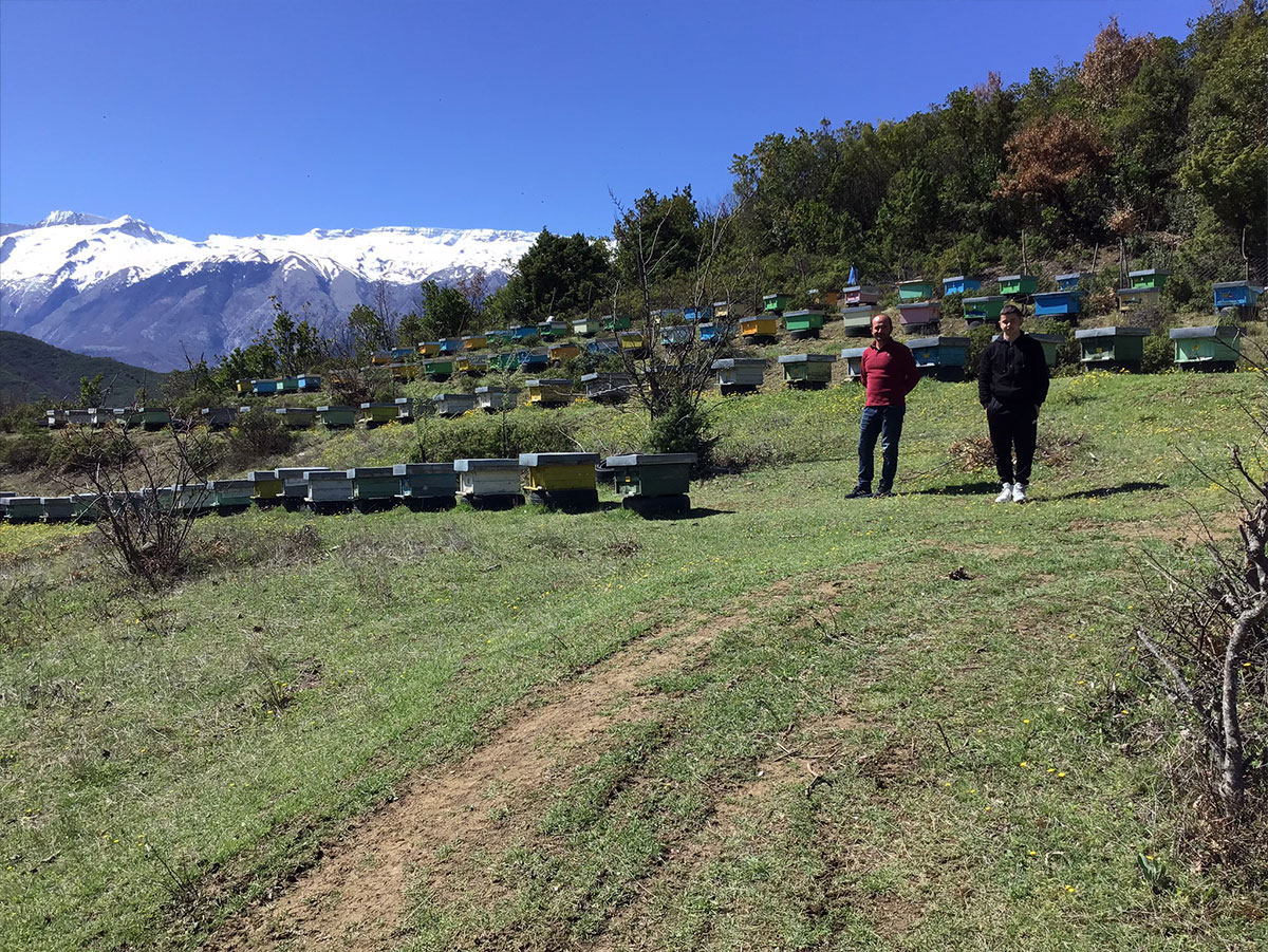 Wir fahren zum Bienenstand. In vier langen Reihen stehen bunte Bienenstöcke im Abstand von mehreren Metern, verteilt über den ganzen Hang. Im Hintergrund leuchtet frischer Schnee vom Gipfel des 2.200 m hohen Nemërçka Gebirges. Imker Krenar Flori erzählt von einer Begegnung mit einem Bären an diesem Bienenstand. Ein Bär habe sich eben an einem Bienenstock gütlich getan, als Krenar sich mit seinem Geländewagen näherte. Der Imker und erfahrene Jäger wusste, dass Bären bei Gefahr stets die Flucht ergreifen. Der Imker zeigt auf eine zerstörte Bienenzarge, die immer noch in einigen Metern Abstand im Gebüsch liegt. Eine leergefressene Bienenwabe hängt an einem Strauch. 15 Völker hat Krenar bereits an Bären verloren, bei einem benachbarten Bienenstand waren es gleich fünf in einer einzigen Nacht.