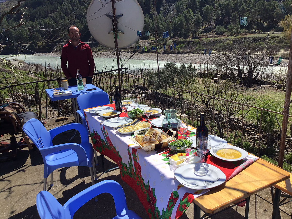 Wir treffen uns am nächsten Tag im Sommerquartier der Familie in der Stadt Përmet. Die Gemüse- und Weinterrassen reichen hinab zum Flussufer der Vjosa. Ein opulentes Mittagessen auf der Sonnenterrasse lässt die Strapazen des Vortages rasch vergessen: Hühnersuppe, Wildschweinragout, getrocknetes Ziegenfleisch, Käse von Schaf und Ziege sowie Honigkuchen. Dazu selbstgemachter Rotwein und Raki. Flora Sali, (39), Krenar Sali, (43), sowie Albas Sali, der 17-jährige Neffe, Jungimker und zugleich auch genialer Übersetzer sitzen mit am Tisch. Die Gastfreundschaft der Albaner ist überwältigend.