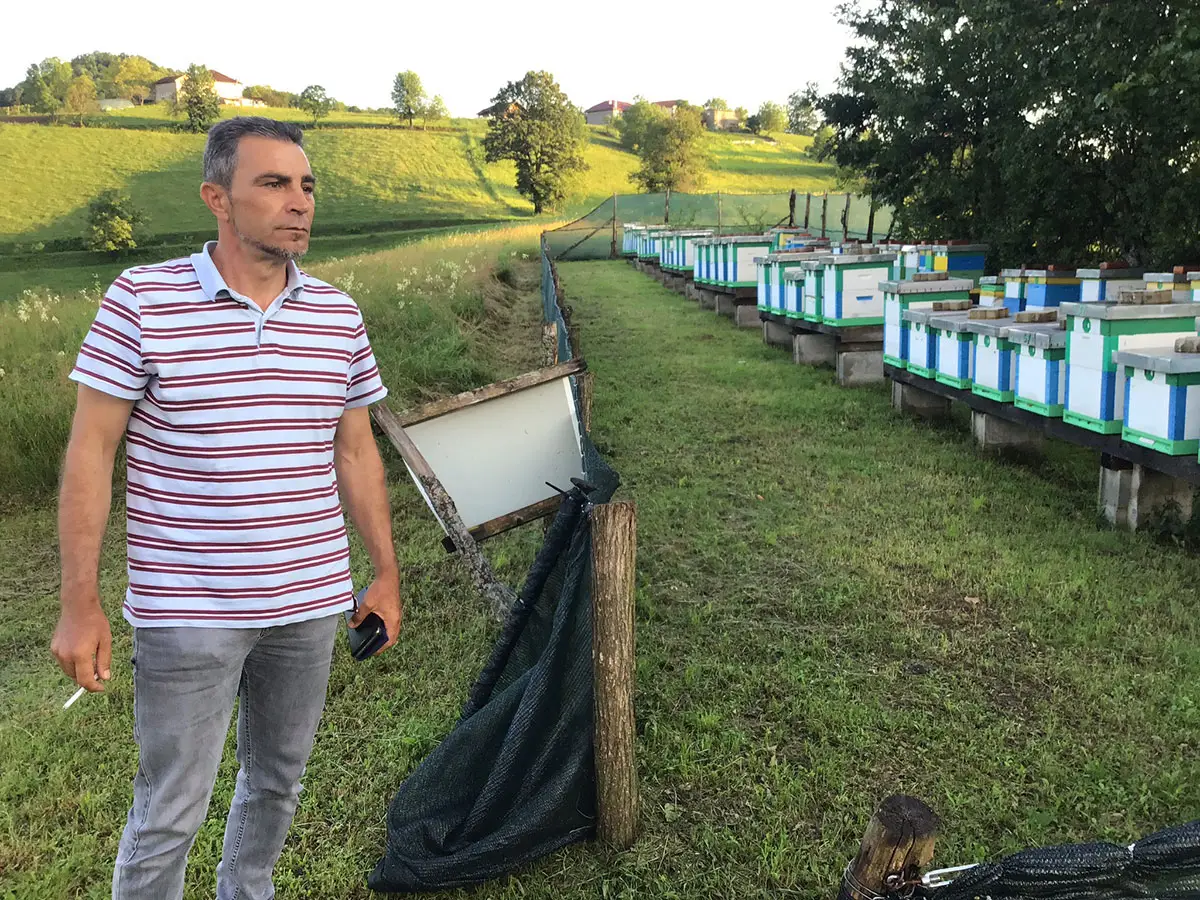 Da es nach Kriegsende kaum wirtschaftliche Perspektiven gab, haben viele Bosnier nach 1995 das Land verlassen. Rasim zählt zu denen, die geblieben sind, um sich mit großem Fleiß und Geschick vor Ort eine Existenz aufzubauen. Anfangs führte er ein kleines Lebensmittelgeschäft in Bužim. Für seine mittlerweile 40 Bienenvölker blieb ihm nur wenig Zeit. Einige Jahre später machte er die Imkerei zu seinem Hauptberuf und bewirtschaftet nun 200 Völker. Seinen Honig und die übrigen Bienen-produkte verkauft er auf Messen im ganzen Land. Was er anders oder besser macht als seine Imkerkollegen? „Wenn ich zu den Bienen gehe, setze ich mich erst hin, rauche eine Zigarette und überlege, was zu tun ist“, meint der Imker ironisch.