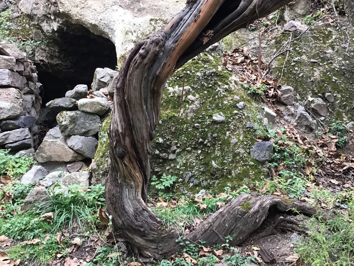 Etwas überrascht ist Bondo von unserer Frage nach Natenadzes Weinstock. Nach einigem Zögern weist er uns den Pfad, der wenige Meter nach seinem Haus nach rechts abzweigt und an einer Felswand entlang ins Gebüsch führt. Inmitten von verwilderten Obstbäumen und direkt neben einer Höhle, die früher als Weinpresse gedient haben soll, finden wir den uralten Rebstock.