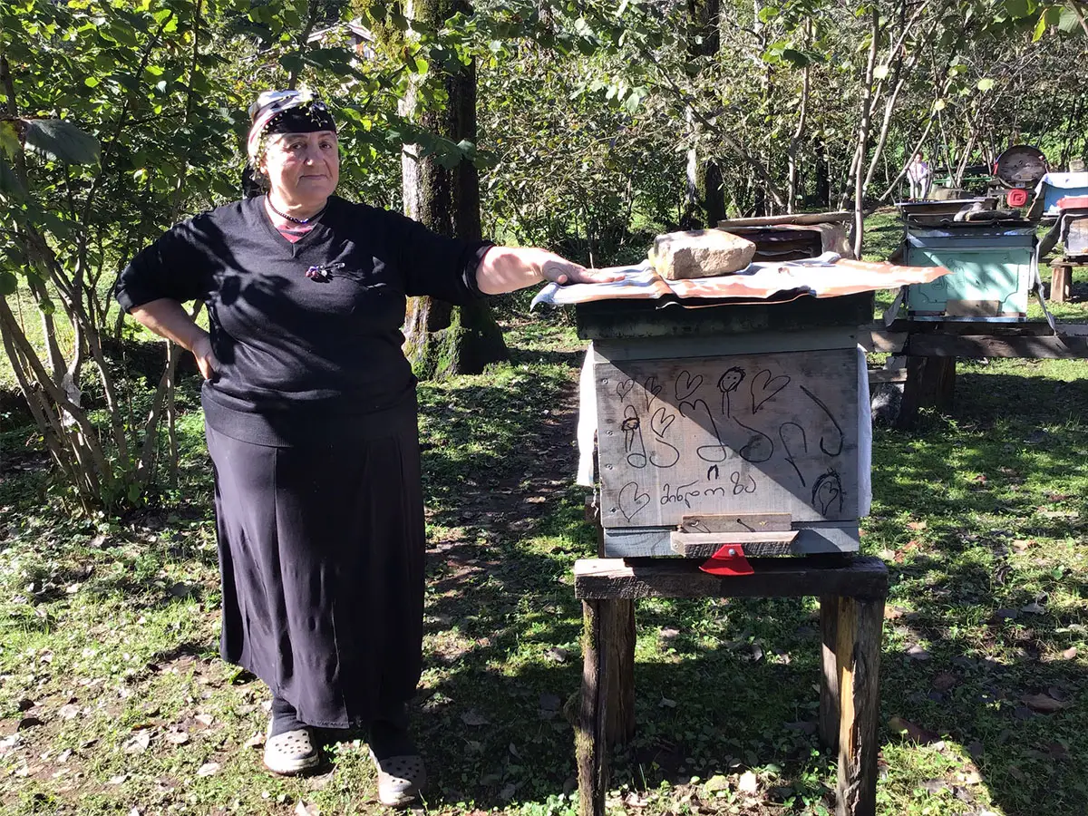 Imker Mindia Samnize, zwei seiner Töchter und seine Mutter vor einem Jara Bienenstock Traditionell wurden Jara Bienenstöcke fern von Siedlungen im Wald in einigen Metern Höhe auf Bäumen befestigt, wo sie vor Bären und anderen wilden Tieren geschützt waren. Ein sicherer Stellplatz waren auch schwer zugängliche Felswände, in denen sie auf teils abenteuerlich anmutende Holzgerüste gestellt wurden. Die meisten der heute noch aktiven Jara Imker verwenden neben den traditionellen Klotzbeuten auch moderne Magazinbeuten und haben diese in der Nähe ihrer Häuser aufgestellt, da dies die Produktivität wesentlich erhöht. So auch im Garten von Mindia Samnize. Der etwa 40-jährige Imker besitzt neben 30 Magazinbeuten auch zwei Jara Bienenstöcke. Er lebt mit seiner Familie auf einem kleinen, malerisch gelegenen Bauernhof in der Nähe der Ortschaft Keda. Das wenige ebene Land, das in dieser bewaldeten, hügeligen Gegend verfügbar ist, wird von den beiden Kühen beweidet oder als Garten genutzt.
