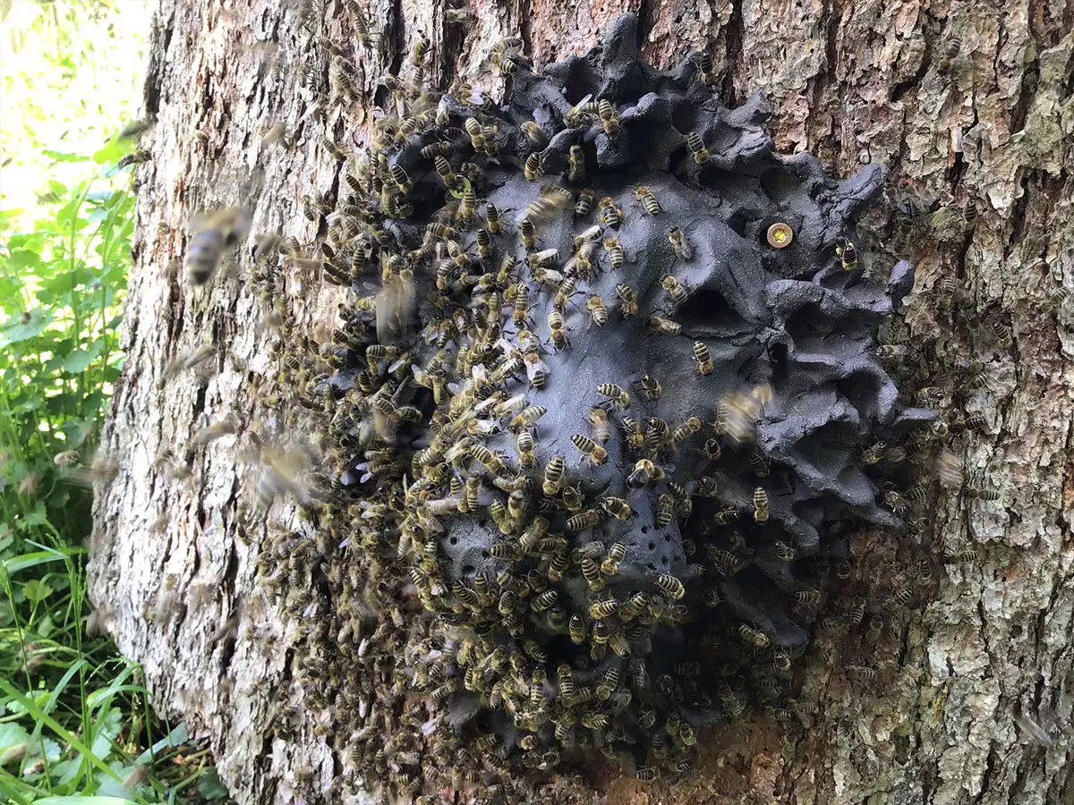 Da keine Maßnahmen zur Schwarmverhinderung erlaubt sind, werden die Schwärme je nach Witterung Ende April bis Ende Mai gefangen. Der dritte Eingriff ist die Ernte der Honigwaben und erfolgt etwa Mitte Juli. Die vollen Waben werden gepresst oder als Wabenhonig verkauft.