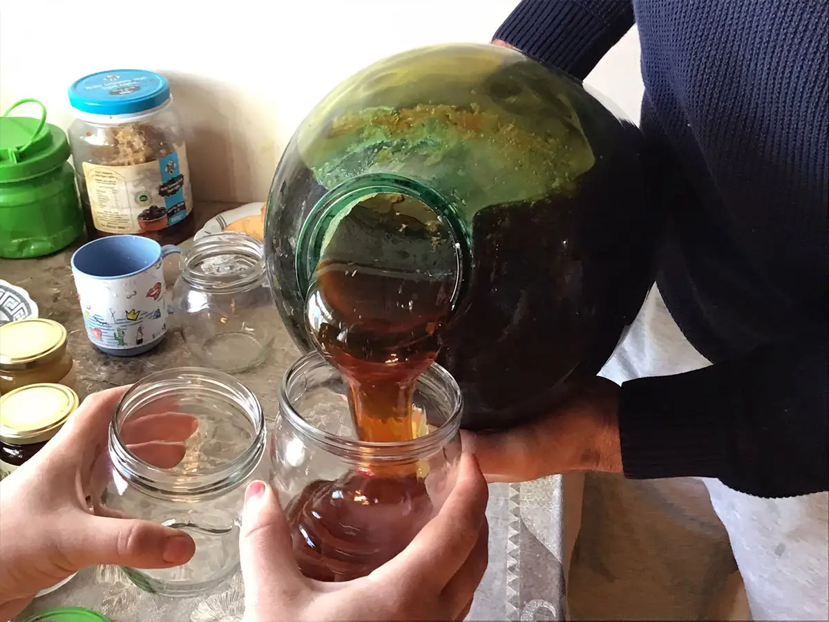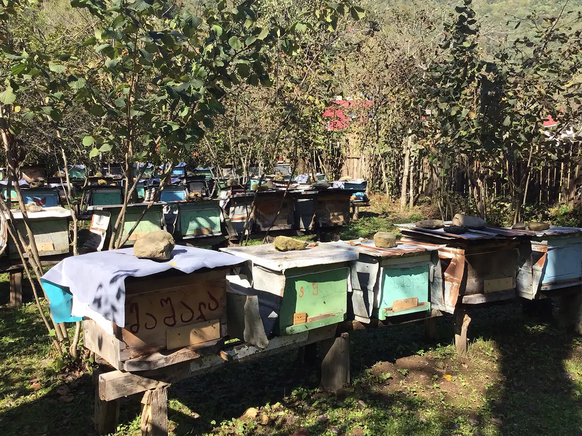 Wie so häufig bei Besuchen von Imkern ist die Gastfreundschaft überwältigend. Auf den Besuch der Bienenstöcke in der Haselnussplantage folgt eine Einladung in das Wohnzimmer des alten Bauernhauses. Mindia führt uns weiter ins Kinderzimmer, wo im hintersten Winkel ein Schatz lagert. Eine großer Glasballon voll Jara Honig. Einige Gläser des zähflüssigen, dunkel-bernsteinfarbenen Honigs werden für die Gäste gefüllt. Die beiden Töchter im Volksschulalter filmen das Schauspiel mit ihren Smartphones.