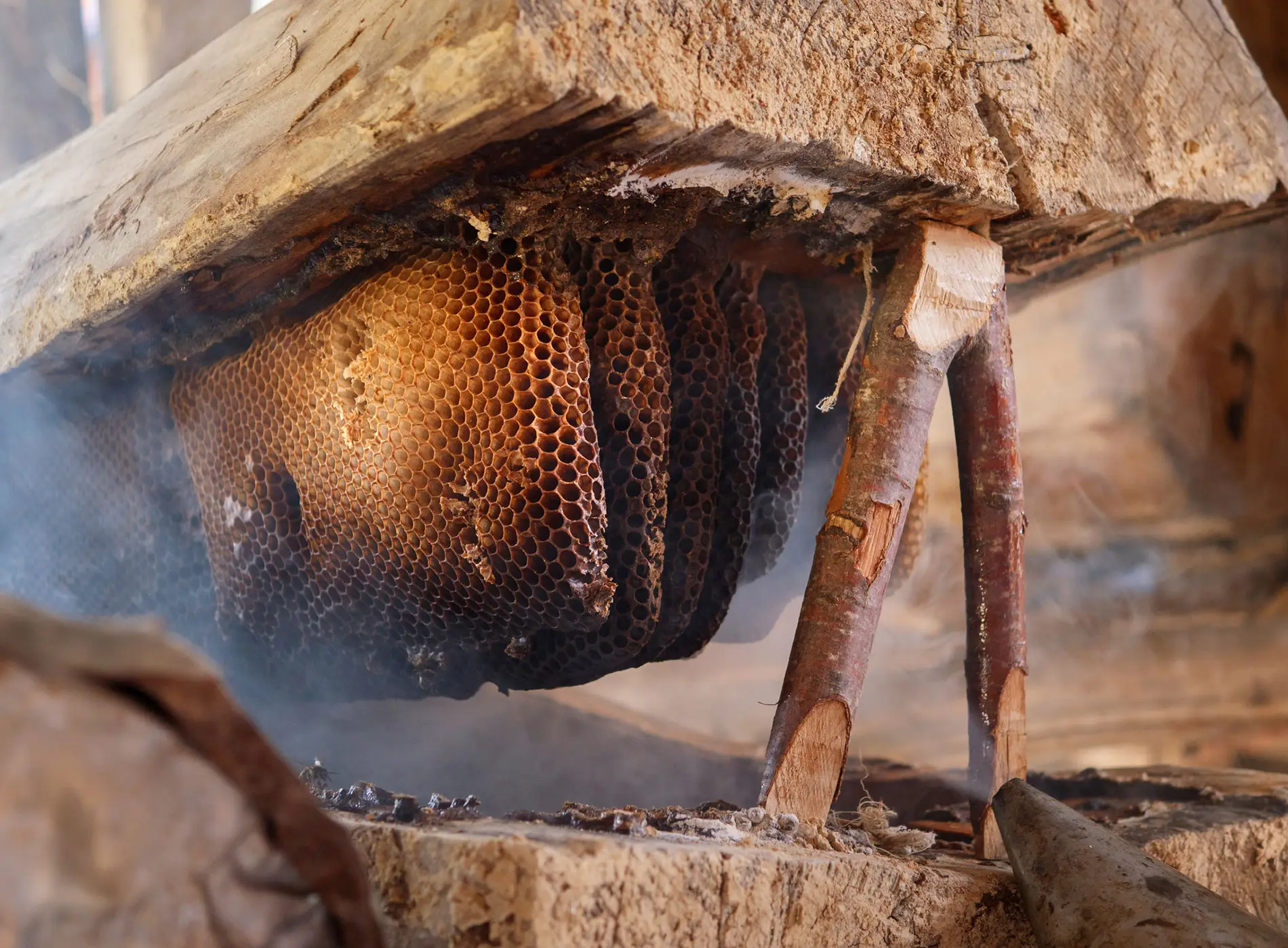 Wie ein halbgeöffneter Sarg liegt der Jara Bienenstock vor uns. Der Deckel wird von einem eingespreizten Holzstück gehalten. Rauch quillt durch den Naturwabenbau, den die Bienen in Längsrichtung an der Innenseite des ausgehöhlten Lindenstammes befestigt haben und die den Hohlraum vollständig ausfüllen: Jara Imkerei, eine archaische Art der Honiggewinnung, die heute noch von etwa 100 Imkern in Adjarien, einer autonomen Provinz im Südwesten Georgiens, betrieben wird.
