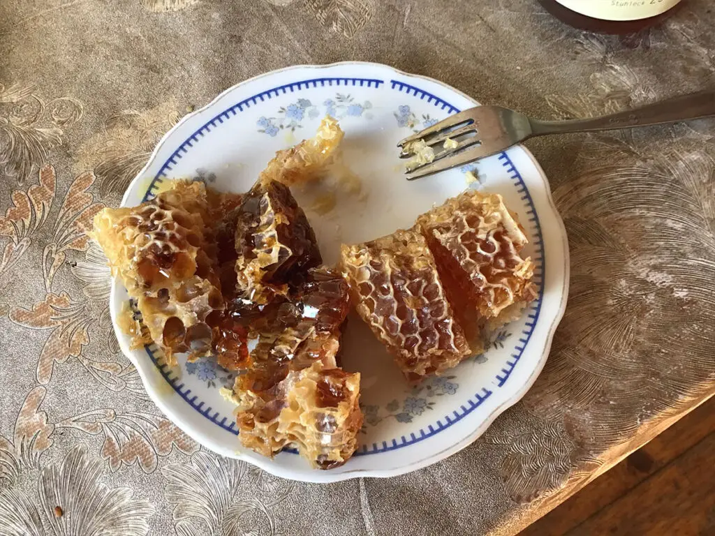 Oma Samnize und ihre Schwiegertochter Darina servieren inzwischen ein großzügiges Mittagessen mit Zutaten aus der eigenen Landwirtschaft. Es gibt Joghurt und mehrere Sorten Käse. Als Beilage kommt gekochter Buchweizen und selbstgebackenes Brot auf den Tisch. Dazu gereicht wird Chacha, ein selbstgebrannter Schnaps sowie Türkischer Kaffee. Und der Höhepunkt des Mahles ist selbstverständlich ein Teller voll mit Wabenstücken des Jara Honigs. Die geschmackliche Dominanz der Edelkastanie im Honig ist unverkennbar. ↓