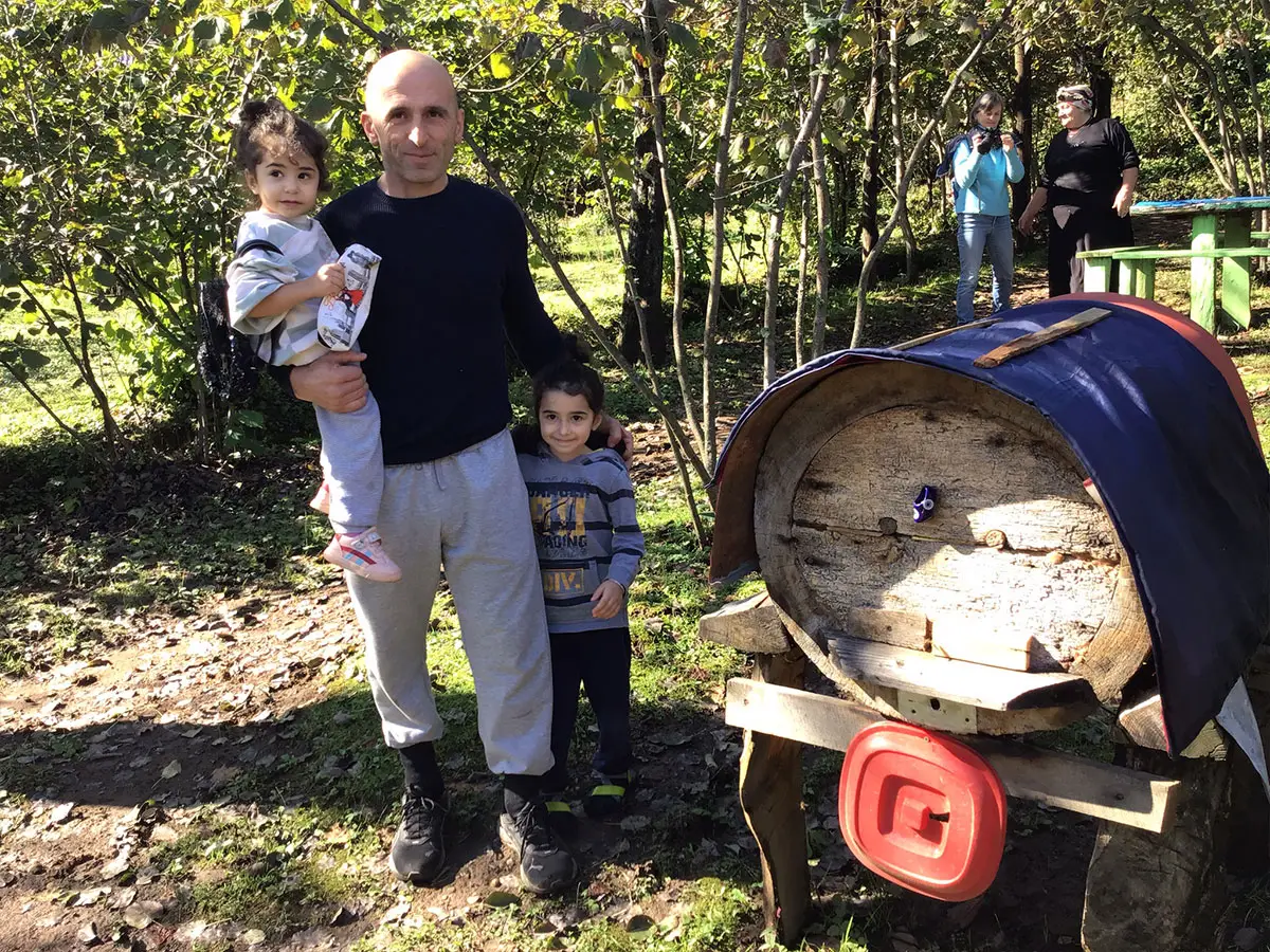 Das Versprechen, nach dem vergeblichen Termin nochmals in Mamukas Trafik vorbeizukommen, lösen wir jetzt gerne ein. Mamuka schließt kurzerhand seinen Laden, setzt sich zu uns ins Auto und weist uns den Weg. An einer engen, steil ansteigenden Hauszufahrt steigt ein weiterer Mann ins Auto. Es ist sein Bruder Mindia, der Imker. Die Schotterstraße wird immer steiler; der Allrad schafft gerade noch den letzten Ruck und wir erreichen das Wohnhaus der Imkerfamilie Samnize. Vier kleine Mädchen, Mindias Ehefrau Darina und seine Mutter begrüßen uns aufs Herzlichste.
