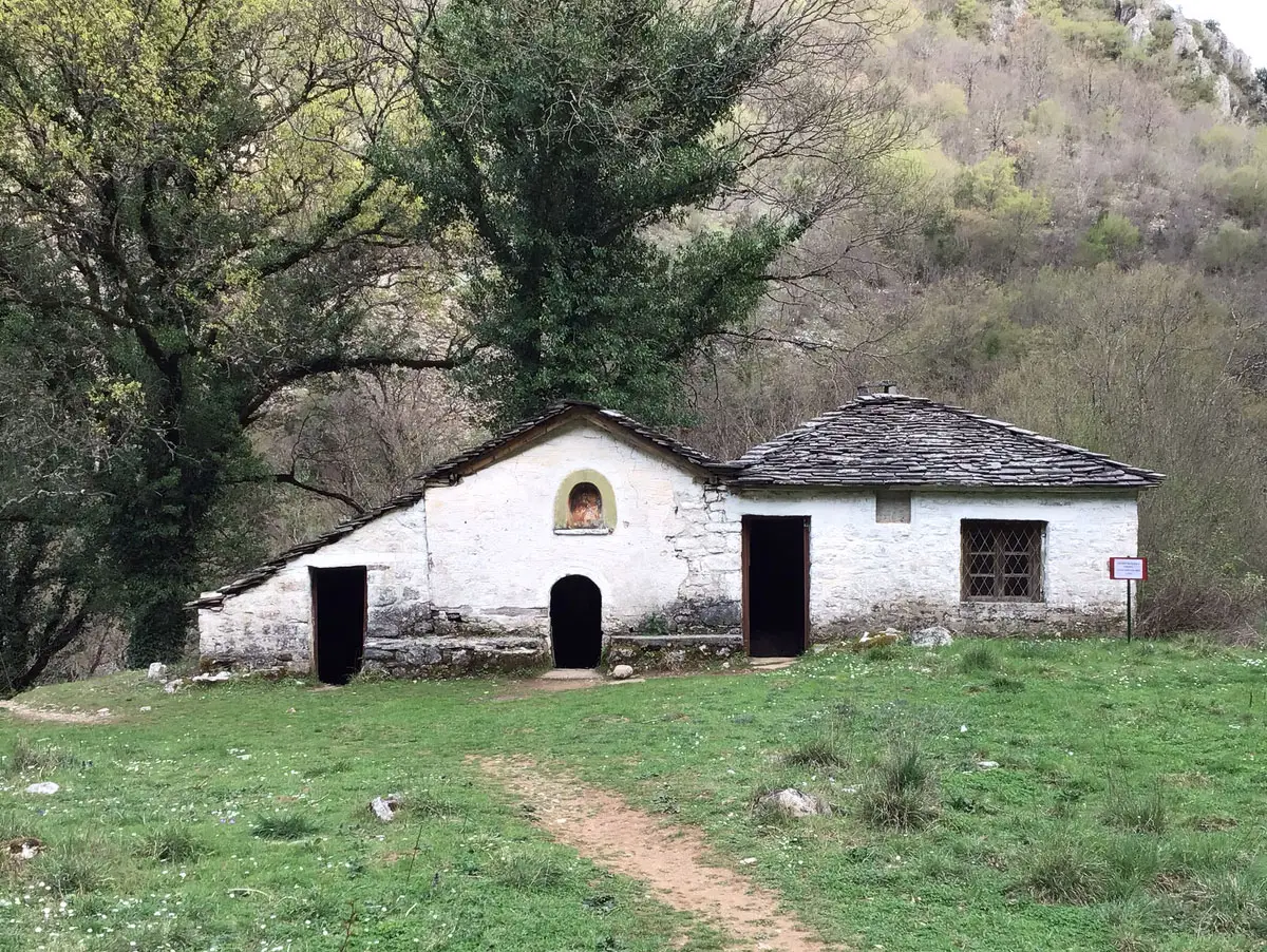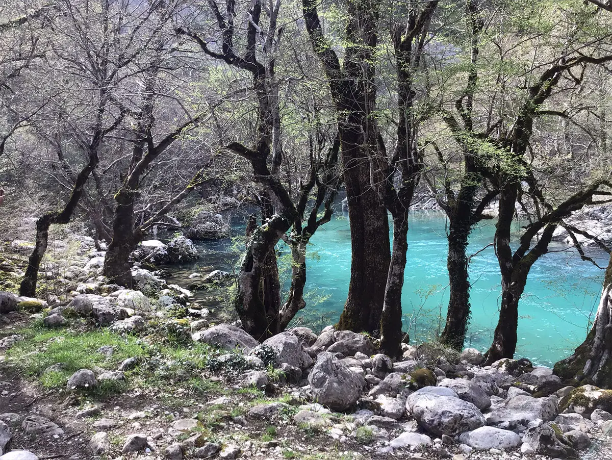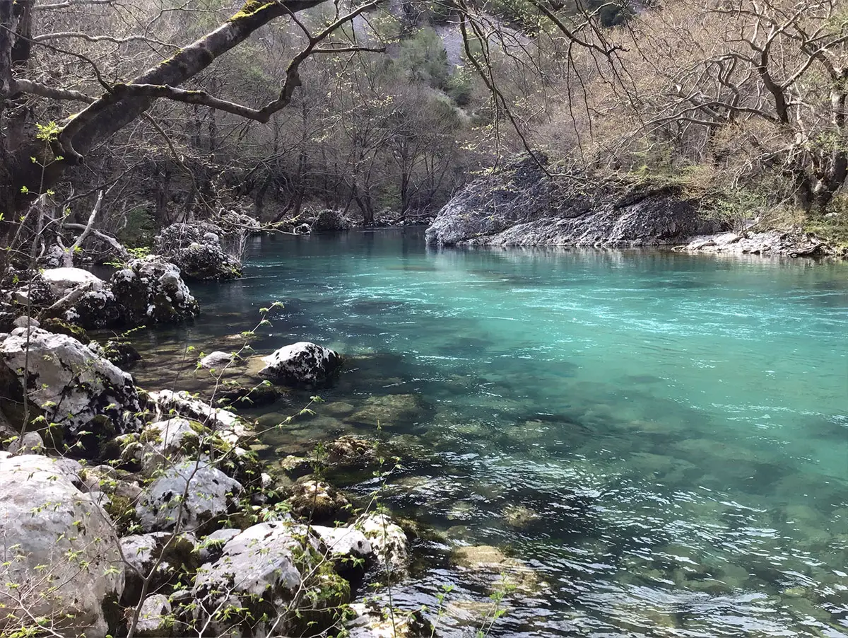 Das erstbeste Wirtshaus erweist sich als Glücksgriff. Die Taverne „En Aristi“ liegt im Schatten zweier riesiger Platanen. Serviert wird Mittagessen vom Feinsten: Delikate Salate, Lamm in verschiedenen Variationen, Moussaka und Bohnenragout. Komfortable Gästezimmer verleiten zu einem erquicklichen Mittagsschlaf. Am späten Nachmittag steigen wir vom Bergdorf Vikos ab in die gleichnamige Schlucht. Zwei gewaltige Felswände öffnen sich in Trichterform, um sich gegen Süden wieder zu verengen. Der Ausblick ist spektakulär, das Rauschen des türkis-blauen Flusses atemberaubend. Unten am Wasser ist ein magischer Ort: Auf einer grünen Anhöhe inmitten von üppigem Bewuchs steht eine kleine orthodoxe Kirche. Ein winziger Eingang führt in einen dunklen Raum mit vergilbten Heiligenbildern an den Wänden. Devotionalien liegen auf dem verfallenen Altar. Links und rechts der steingedeckten Kirche befinden sich Nebenräume. Der eine Raum könnte als Stall gedient haben, ein Kamin in der Wand des anderen vermittelt eher Wohnzimmeratmosphäre: Die perfekte Eremitage eines Heiligen. Etwas unterhalb der Kirche tritt Quellwasser aus dem Gestein und fließt direkt in den Fluss. Eine Allee von Platanen säumt beidseitig das Flussufer, darunter ein unüberschaubares Gemenge von Schwemmholz und gerundeten Felsen, beides von Moos, Flechten und Efeu überwachsen. Der Fluss Voidomatis gibt nur wenig von seinem Verlauf preis und ver-schwindet bereits nach wenigen Metern um eine Biegung. Er entspringt im Pindosgebirge und vereinigt sich bereits wenige Kilometer flussabwärts mit dem Aoos. Als Vjosa durchfließt er als letzter gänzlich unregulierter Fluss den Südwesten Albaniens, um nahe Vlora ins Ionische Meer zu münden.