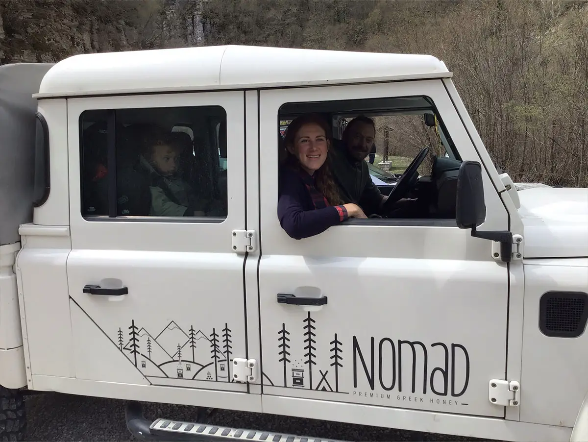 Nahe der steinernen Brücke von Koukouli hält ein weißer Jeep älteren Baujahres. In schmalen Lettern prangt der Schriftzug „Nomad Honey“, darunter stilisierte Bienenstöcke in einem Fichtenwald, das markante Logo des jungen Imkerpaares. Eleni, 39, ihr Mann Vassilis, 42, beide eher nordländische Erscheinungen und ihr dreijähriger Sohn Nicolas mit langen blonden Locken sind im Auto. Die nur wenige Wochen alte Tochter Eftichia ist in der Obhut der Großeltern geblieben. Nach einer kurzen Begrüßung folgt die Aufforderung: „Folgt uns im Auto!“ Wie so oft auf Imkerreisen beginnt eine Reise ins Ungewisse, die etliche Stunden dauern wird, die uns an Orte führt, die nur Einheimische kennen und in Wirtshäuser die allen Klischees von „reisen wie damals“ entsprechen.