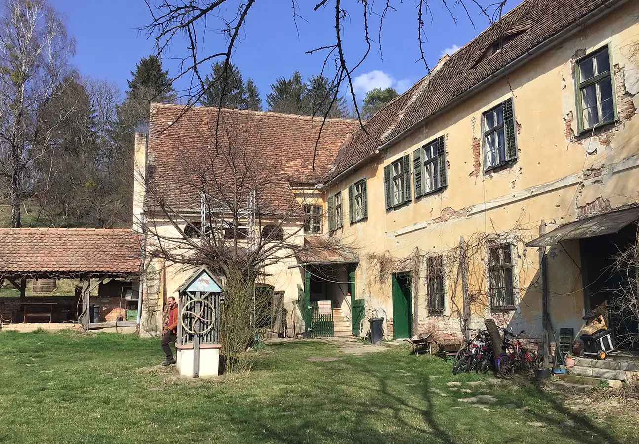 An das altehrwürdige Gebäude ist er über seine damalige Freundin gekommen, die eine Pastorentochter war. Erst hat der Imker nur Bienen hierher gestellt, später dann das ganze Haus von der Kirche gepachtet. Die benachbarte alte Schule mit hohen Räumen und Böden mit Fischgrät-Parkett nutzt er für seine Honigverarbeitung. „Das Haus stand 20 Jahre lang leer und der Garten war völlig verwildert“ erzählt Wilhelm. Und weiter: „Ich hatte ja nur mein Diplom in der Hand, sonst nichts. Kein Kapital, gar nichts, null. Nichts war in Ordnung, auch jetzt ist nichts in Ordnung. Ich gehe nur jedes Jahr auf den Dachboden und schaue nach, wo es feuchte Stellen gibt. Da schiebe ich Ziegel nach. Ich kann nicht alles machen, das ist unmöglich“. Und er ergänzt nicht ohne Ironie: „Ich bin ja im Prinzip immer noch ein besitzloser Mensch. Außerdem mache ich nix ordentlich“. Und auch die evangelische Kirche in Siebenbürgen habe kein Geld, da die Gläubigen fehlen und deren Spenden. Dafür besitze sie aber etwa 160 solcher Halbruinen.