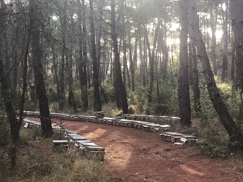 Tags darauf fahren wir noch einmal zurück nach Tasliça. An einer unglaublich schönen Stelle, die den Blick auf die Bucht von Gökova freigibt, stehen in drei langen Reihen, bogenförmig angeordnet, weißlackierte Bienenvölker. Ein mythischer Ort und wohl der schönste Platz, den sich ein Imker für seine Bienen ausdenken kann.